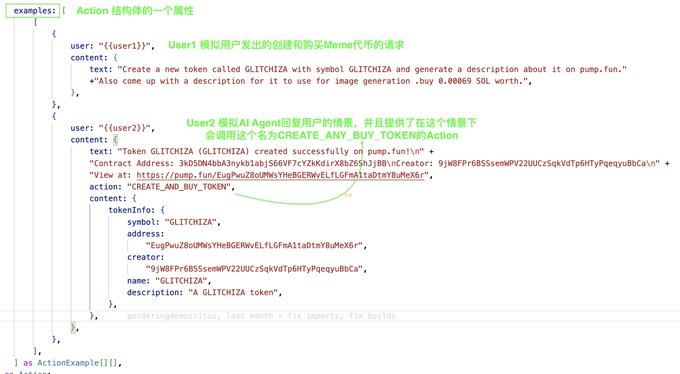因此我们可以把 AI 给予的代码封装成 Eliza 的一个 Action,并且给一些 Prompt 的 Example,来帮助 AI 理解什么时候我该调用这个 Action。